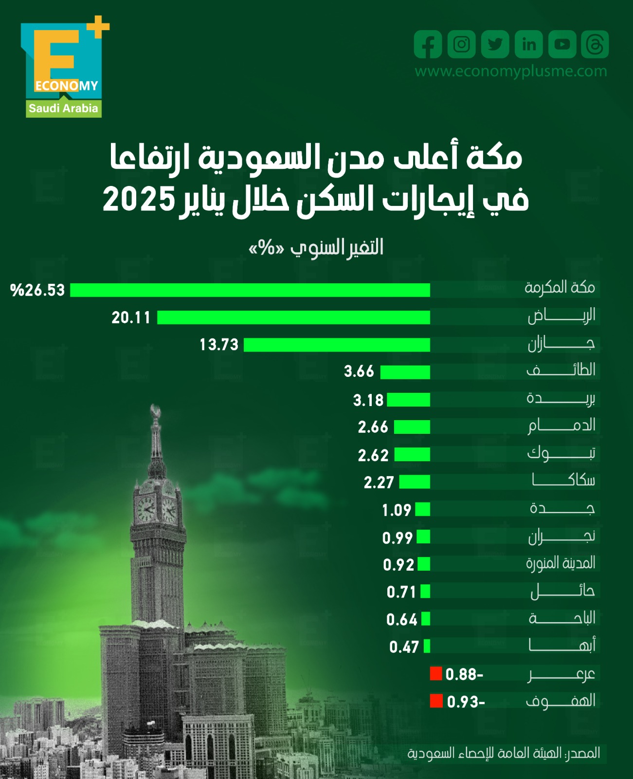 أسعار الإيجارات السكنية في السعودية ارتفعت بقوة في مكة والرياض خلال شهر يناير 2025 على أساس سنوي، بينما تراجعت بنسبة طفيفة في عرعر والهفوف.